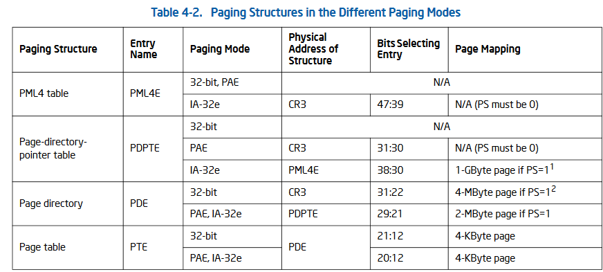 The following image is a table laying out the paging structures present depending on the specific mode of the processor. (Consult Chapter 4 – Paging in the Manual)